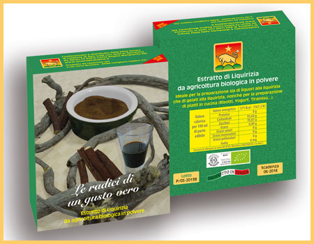 Estratto di Liquirizia da agricoltura biologica in polvere, ideale per la preparazione sia di liquori alla liquirizia che di gelati alla liquirizia, nonchè per la preparazione di piatti in cucina (Risotti, Yogurt, Tiramisù...).